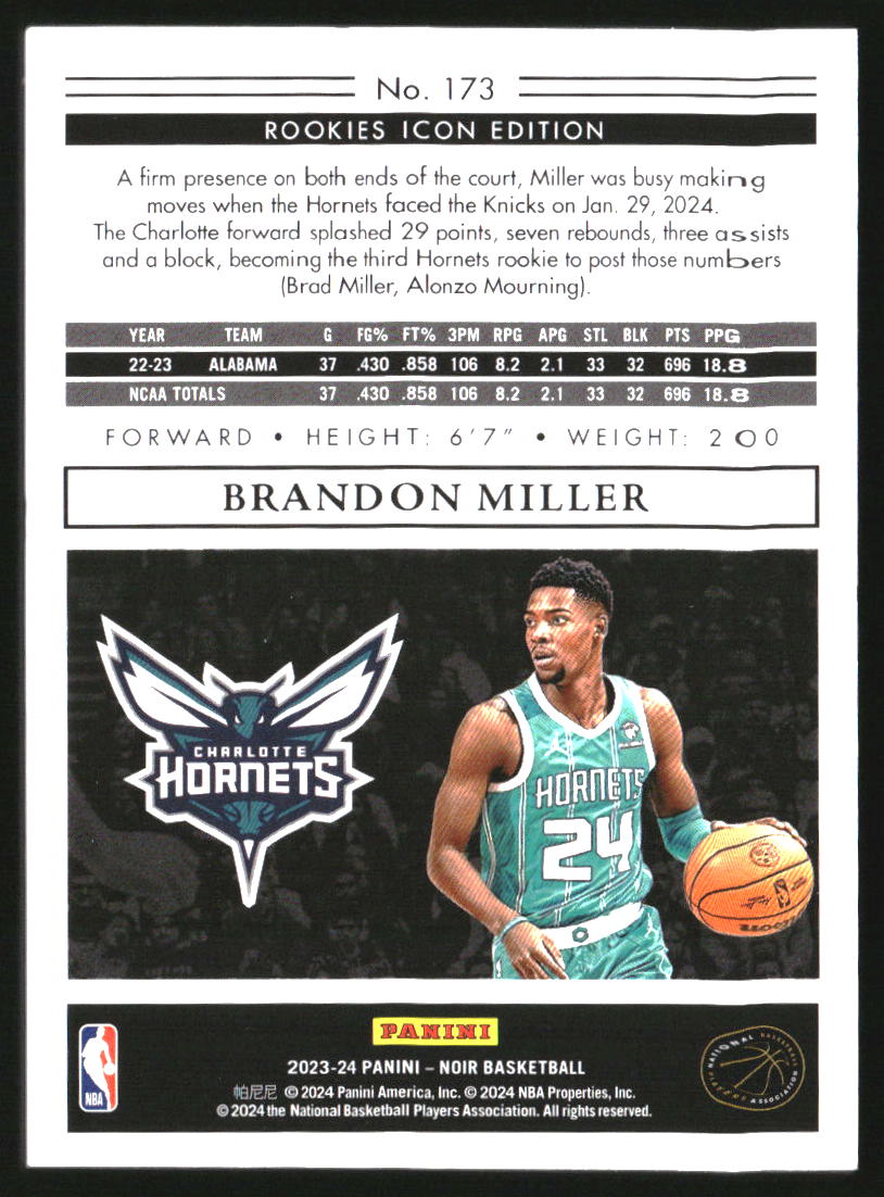 2023-24 Panini Noir Holo Silver #173 Brandon Miller RC Rookie /49