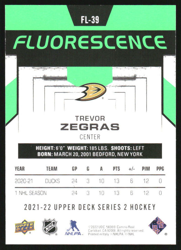 2021-22 Upper Deck Fluorescence Green #FL39 Trevor Zegras /15