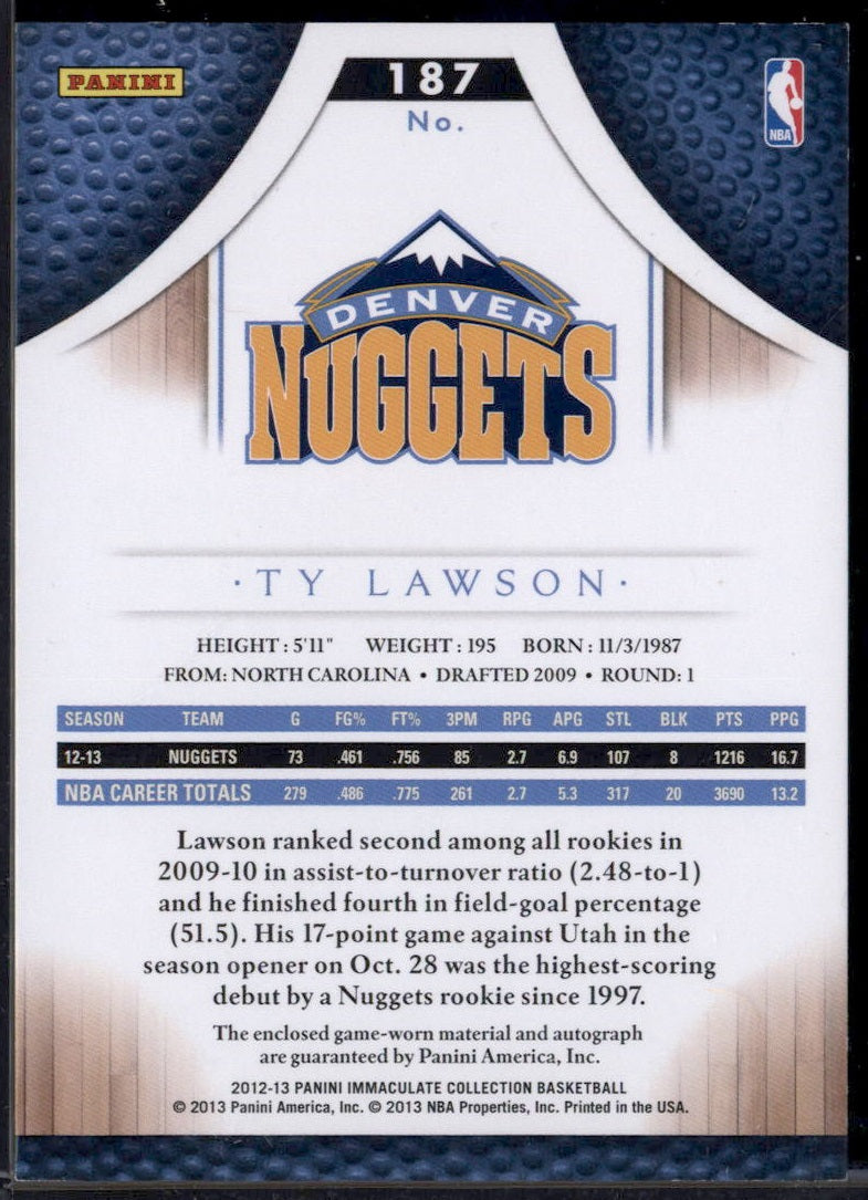 2012-13 Immaculate Collection Patch Autographs Ty Lawson Auto /25
