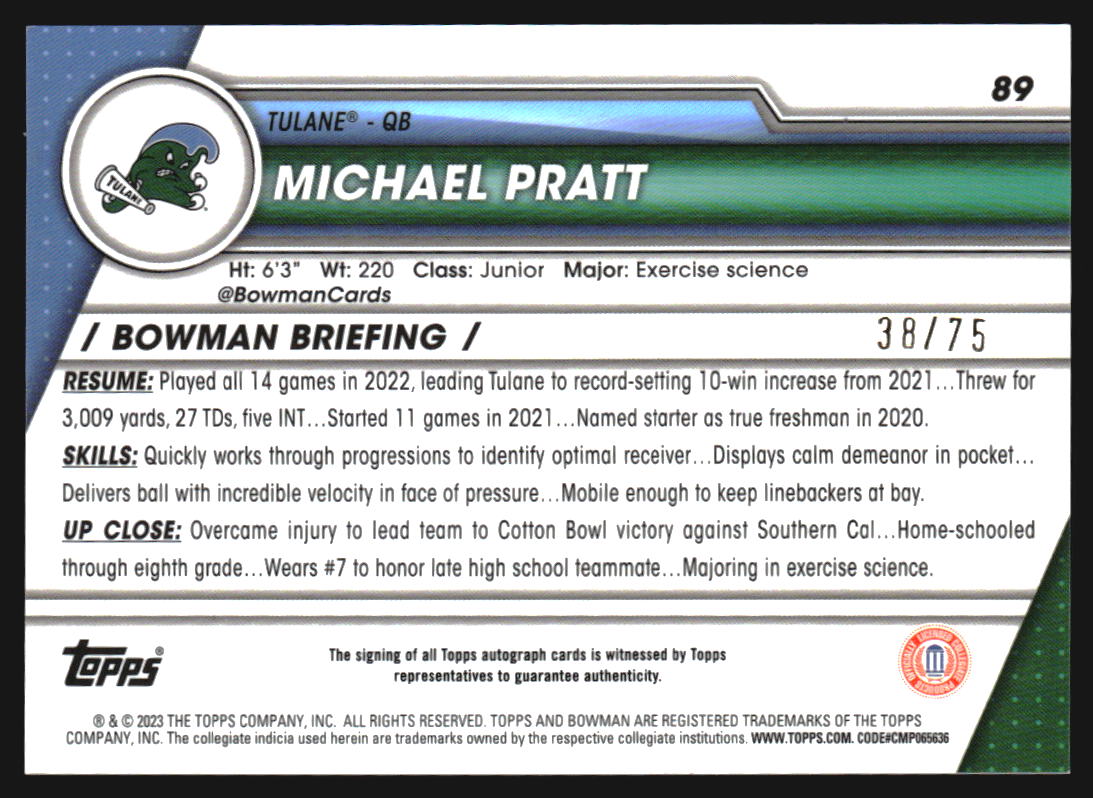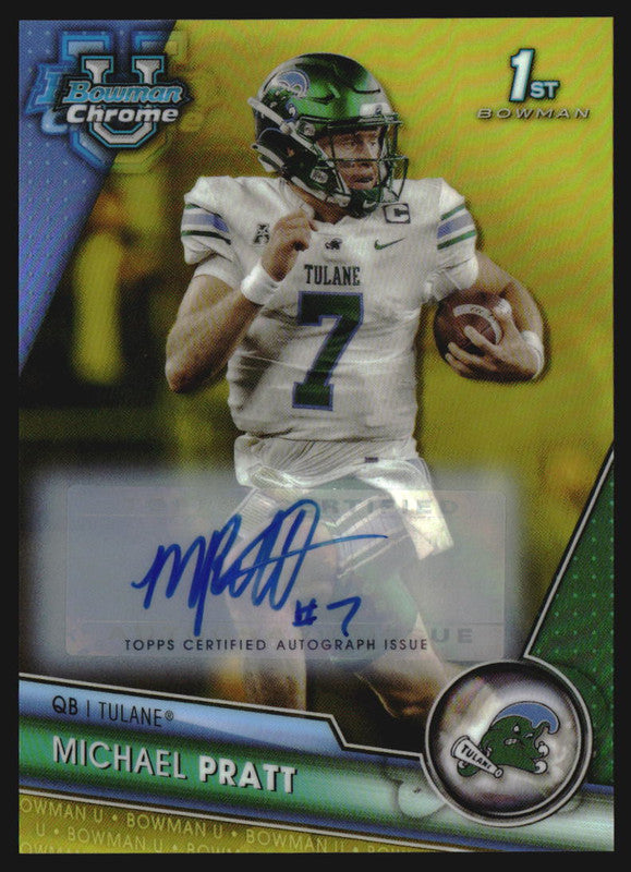 2023 Bowman Chrome University Autographs Yellow #89 Michael Pratt RC Auto /75