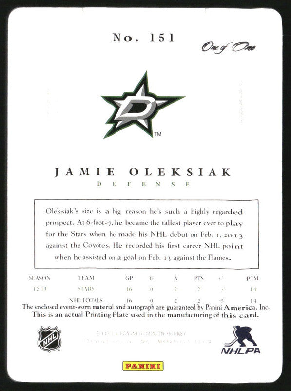 2013-14 Dominion Printing Plates Black #151 Jamie Oleksiak Auto Jersey 1/1
