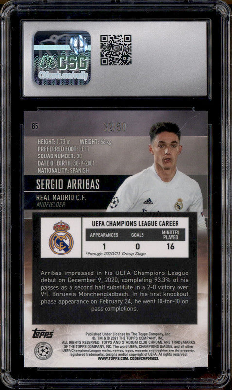 2020 Stadium Club Chrome UCL Gold Refractor #85 Sergio Arribas RC /50 CGC 10