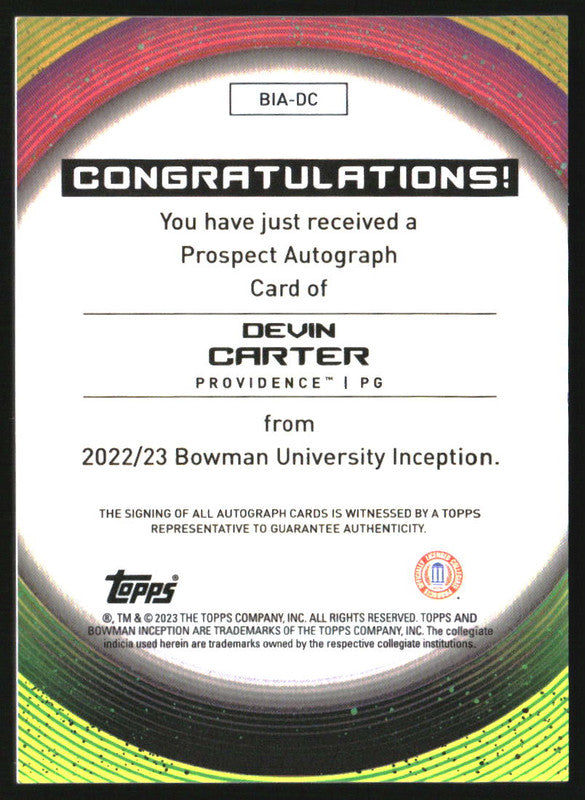 2022-23 Bowman Inception University Autographs #BIADC Devin Carter Auto
