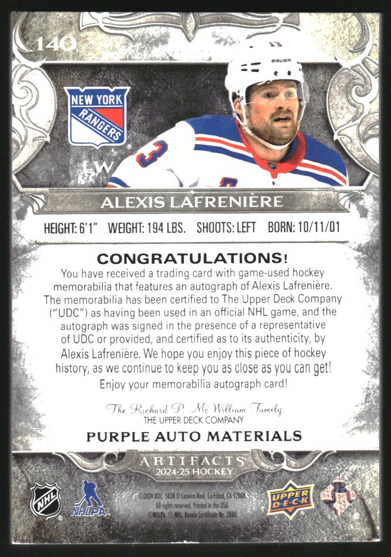 2024-25 Artifacts Material Autographs Purple #140 Alexis Lafreniere Auto /10