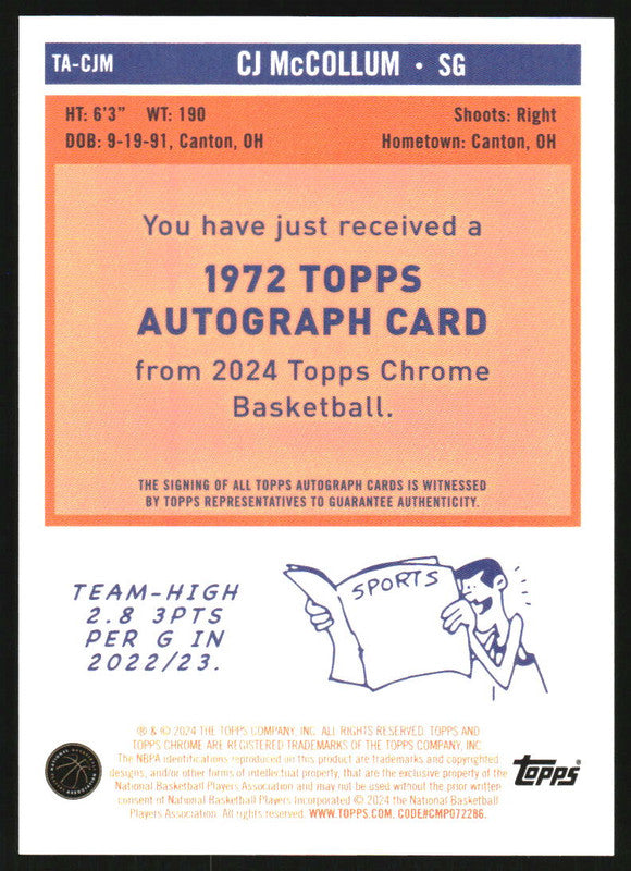 2023-24 Topps Chrome '72 Topps Autographs Gold Refractors CJ McCollum Auto /50