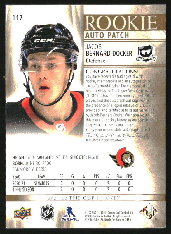 2021-22 The Cup Gold #117 Jacob Bernard-Docker RC Patch Auto /24
