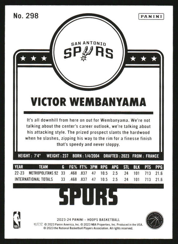 2023-24 Panini Hoops #298 Victor Wembanyama RC