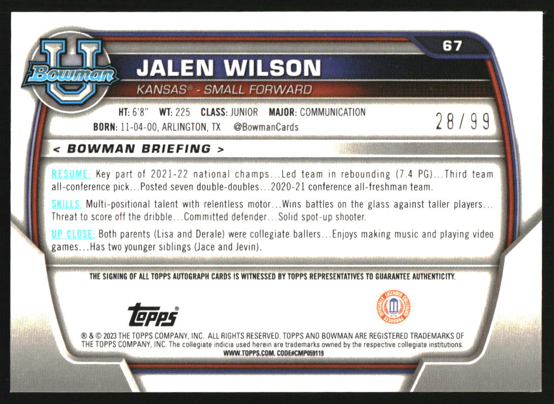 2022 Bowman Chrome University Prospect Autograph Green Jalen Wilson RC Auto /99