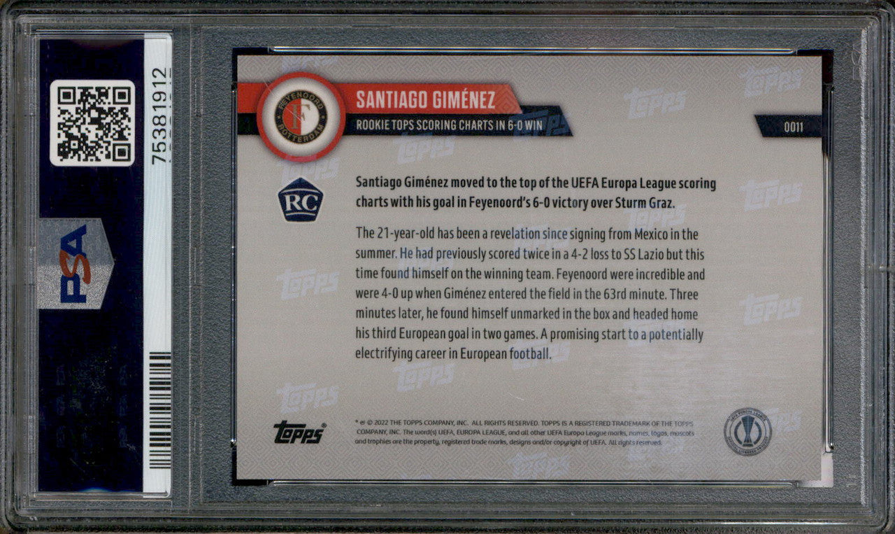 2022 Topps Now UEFA Europa League #11 Santiago Gimenez RC Rookie PSA 10