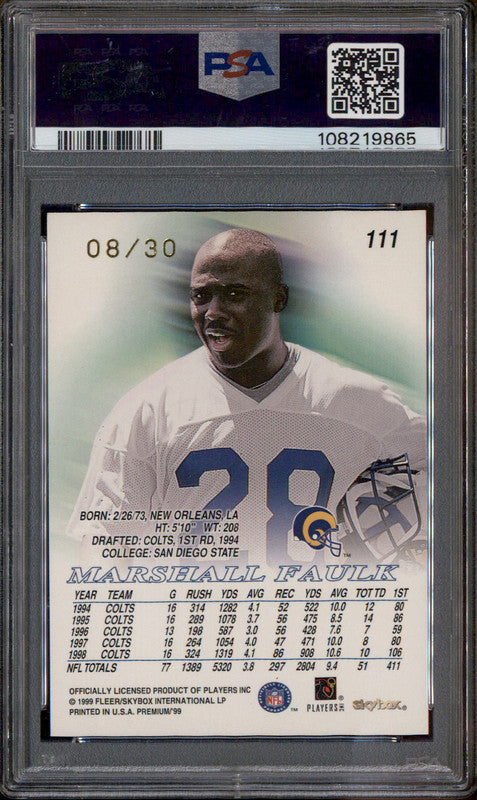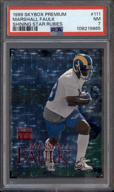 1999 Skybox Premium Shining Star Rubies #111 Marshall Faulk /30 PSA 7