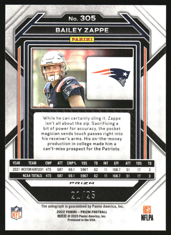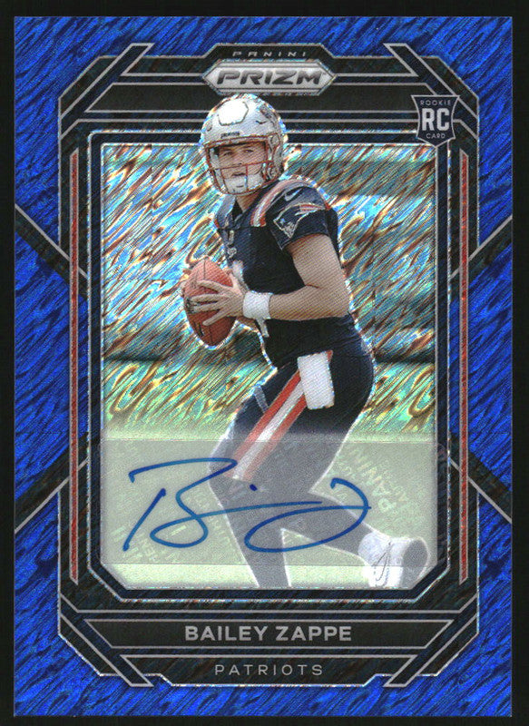 2022 Panini Prizm Autographs Prizm Blue Shimmer #305 Bailey Zappe RC Auto /25