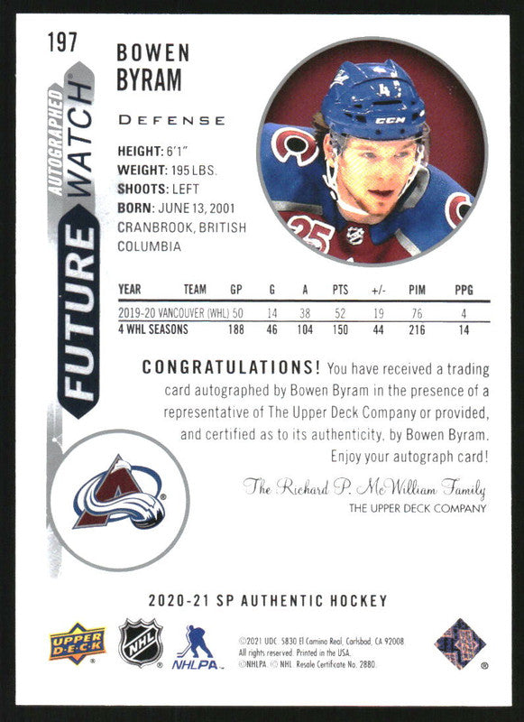 2020-21 SP Authentic #197 Bowen Byram Rookie Autograph RC Auto /999