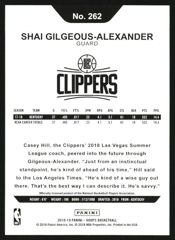 2018-19 Panini Hoops #262 Shai Gilgeous-Alexander RC