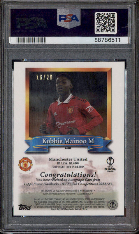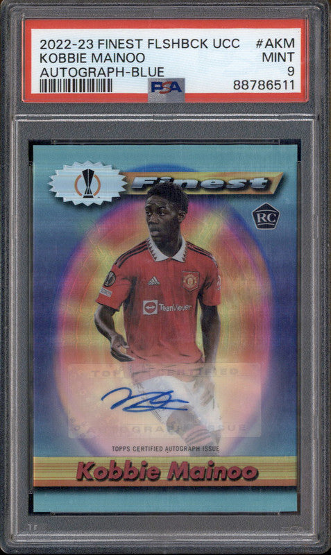 2022-23 Topps Finest Flashbacks UEFA Auto Blue #AKM Kobbie Mainoo RC /20 PSA 9