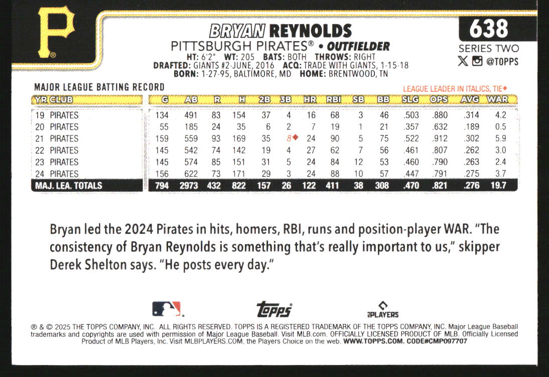 2025 Topps Team Color Border Variation #638 Bryan Reynolds