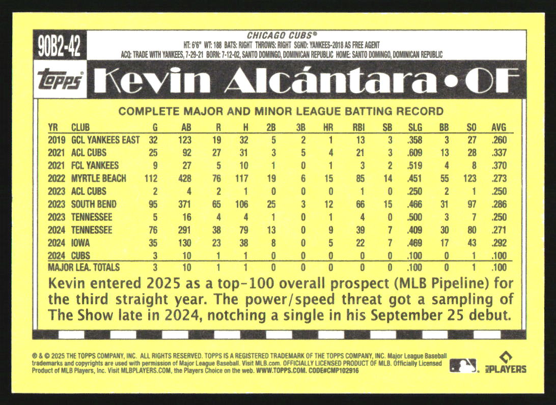 2025 Topps 1990 35th Anniversary The Real One #90B2-42 Kevin Alcantara RC /90