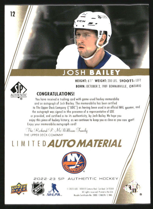2022-23 SP Authentic Limited Auto Material #12 Josh Bailey Auto /100