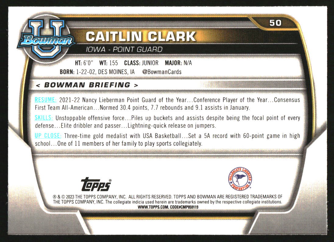 2022-23 Bowman Chrome University #50 Caitlin Clark