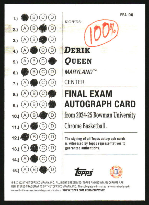 2024-25 Bowman University Chrome Final Exam Autographs #FEA-DQ Derik Queen Auto