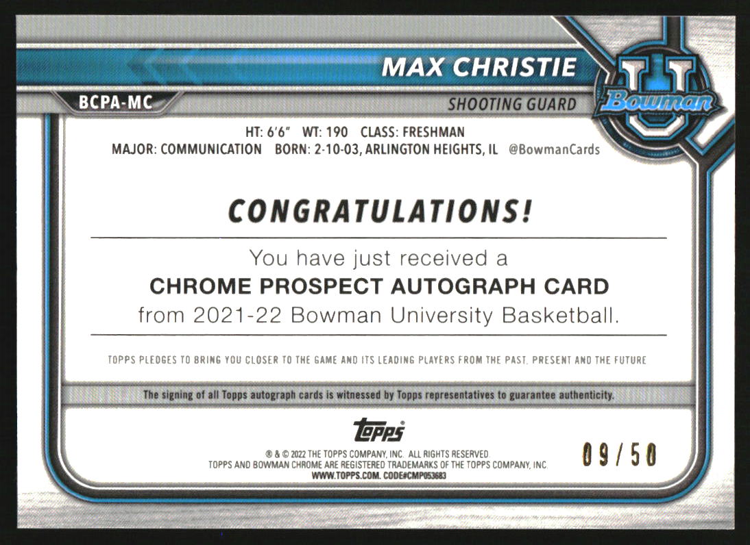 2021-22 Bowman Chrome University Prospect Autographs Gold Max Christie Auto /50