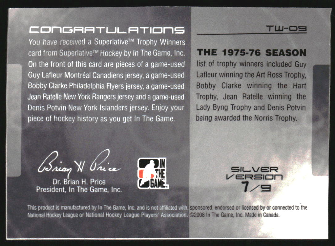 2007 ITG Quad Jersey Silver Lafleur Bobby Clarke Jean Ratelle Denis Potvin /9
