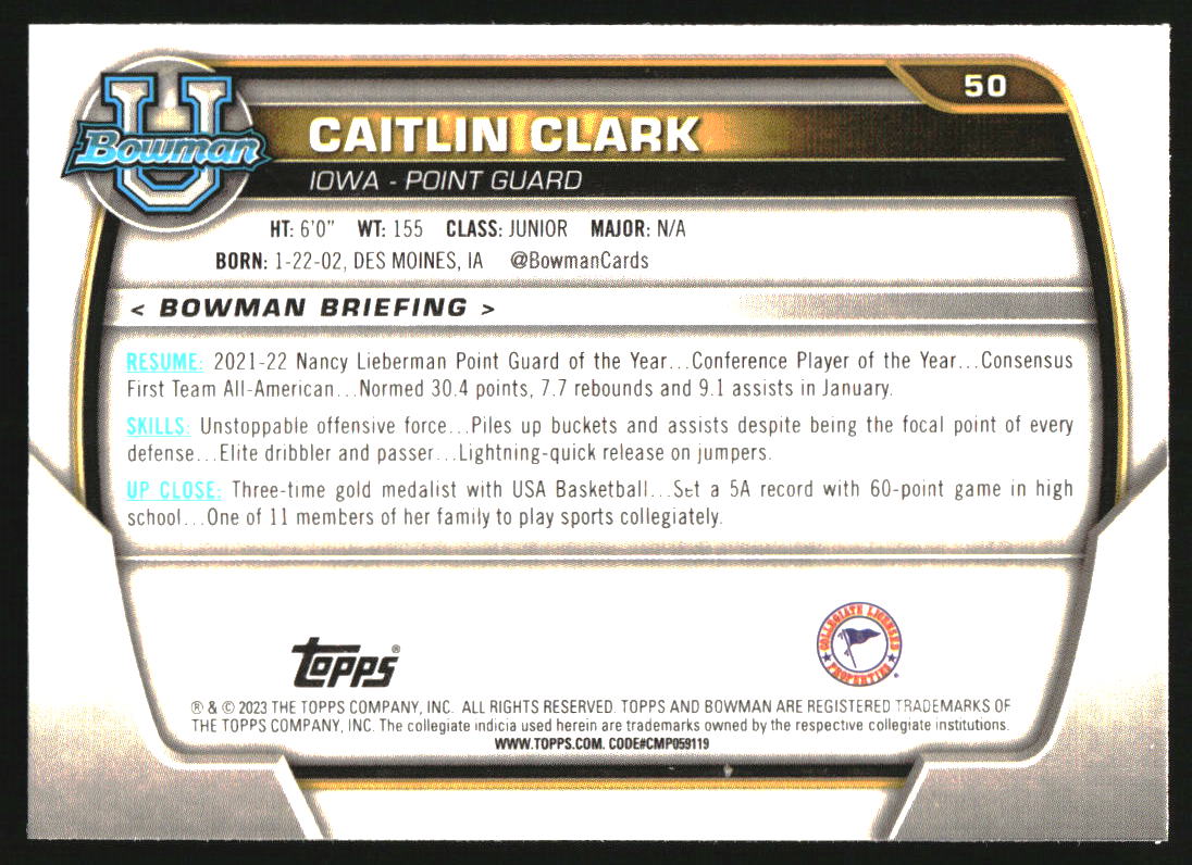 2022-23 Bowman Chrome University #50 Caitlin Clark