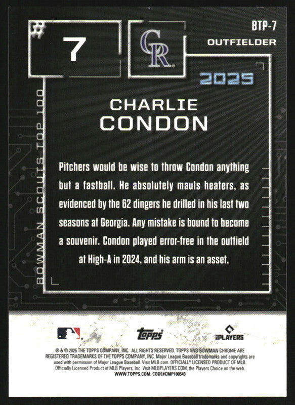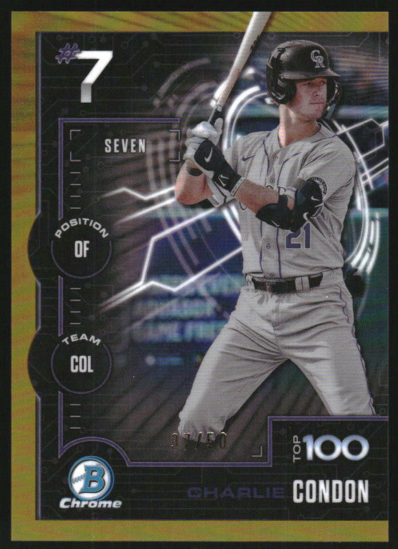 2025 Bowman Bowman Scouts' Top 100 Gold Refractor #BTP-7 Charlie Condon /50