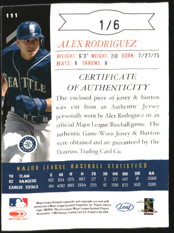 2003 Leaf Limited Threads Button #111 Alex Rodriguez /6
