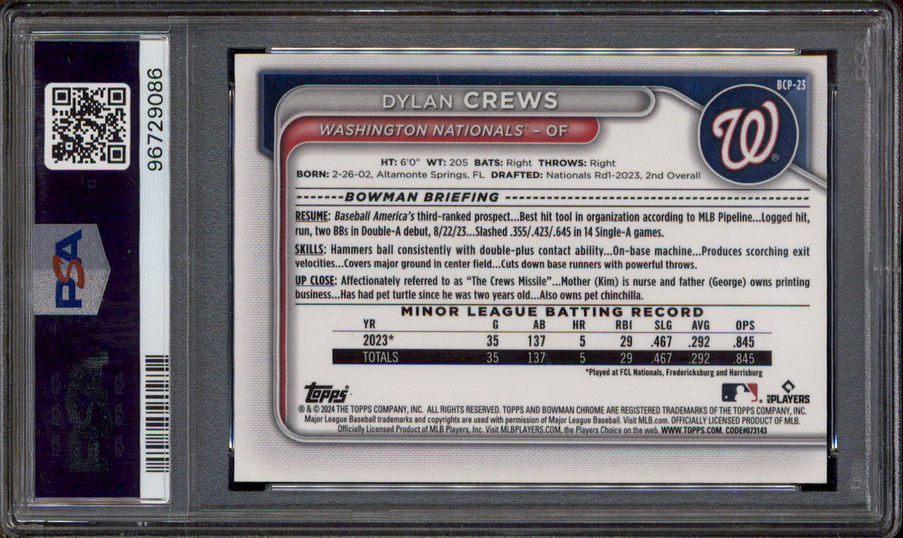 2024 Bowman Sapphire Chrome Prospects #BCP23 Dylan Crews RC PSA 8