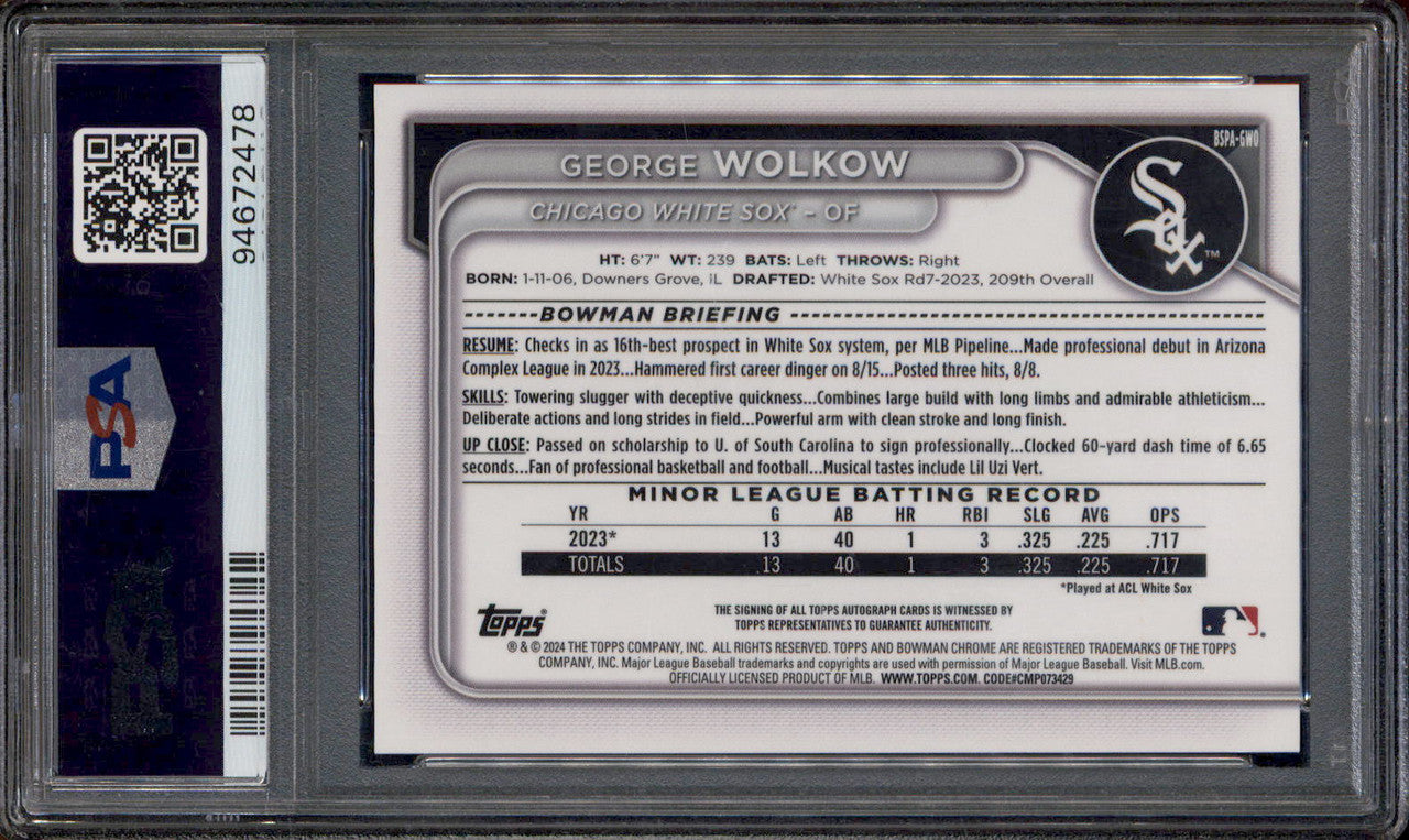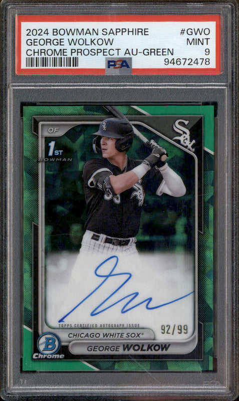 2024 Bowman Sapphire Chrome Prospects Auto Green George Wolkow RC /99 PSA 9
