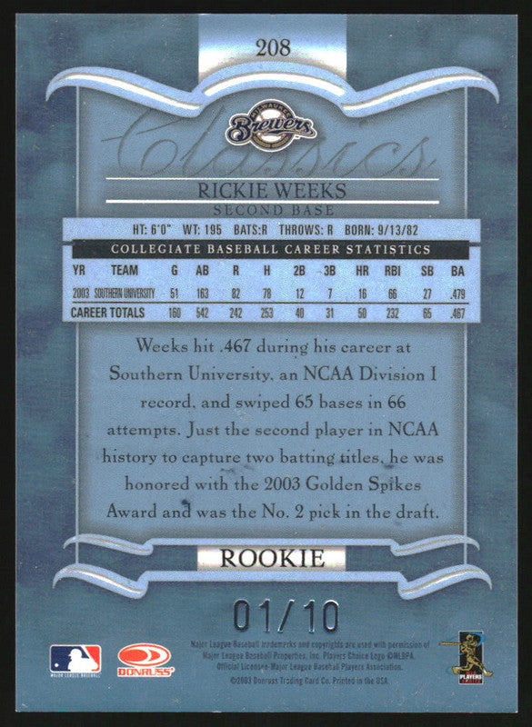2003 Donruss Classics Rookies & Traded Significant #208 Rickie Weeks RC Auto /10