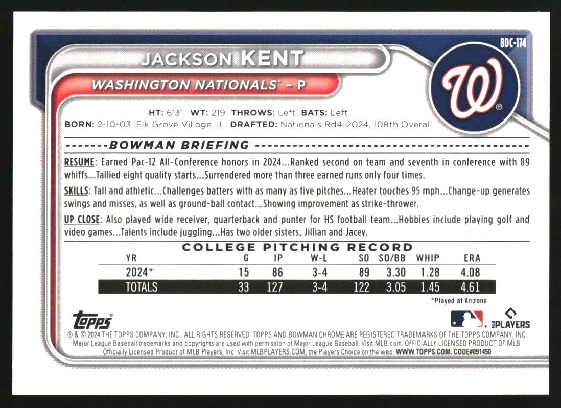2024 Bowman Draft Chrome Black Refractor #BDC-174 Jackson Kent RC /10