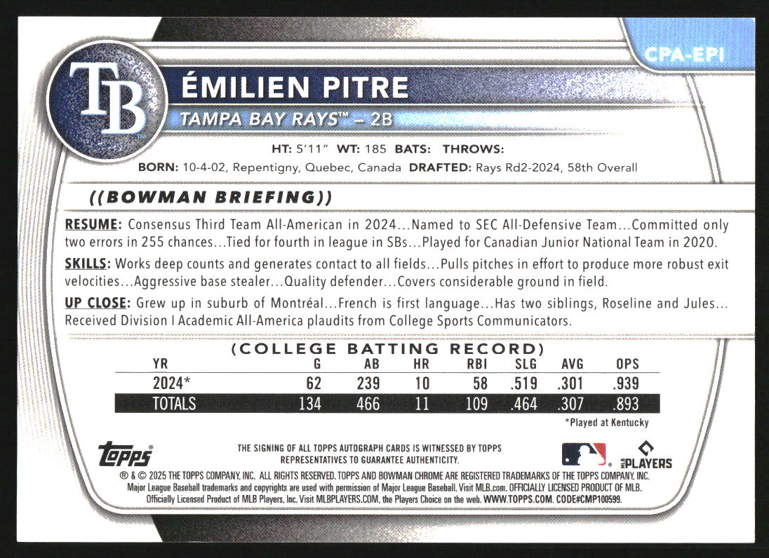 2025 Bowman Chrome Autographs Green Grass #CPA-EPI Emilien Pitre RC Auto /99