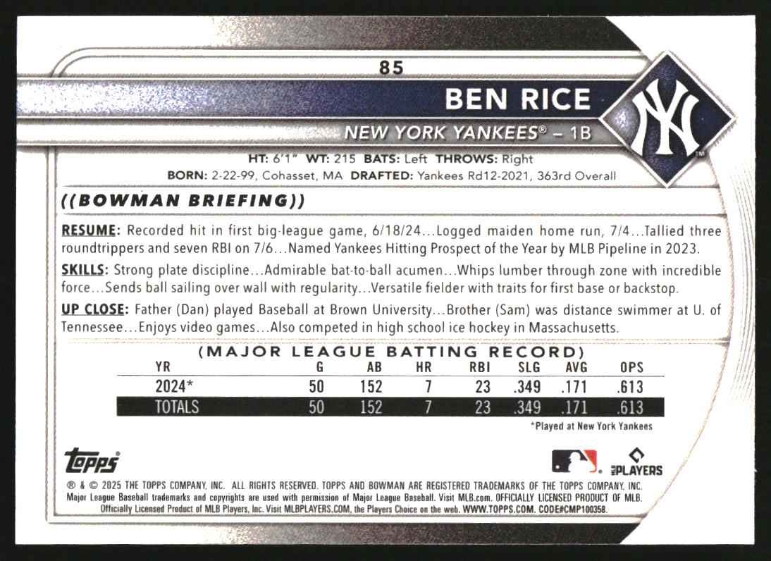 2025 Bowman Chrome Red RC Rookie Redemption #85 Ben Rice RC
