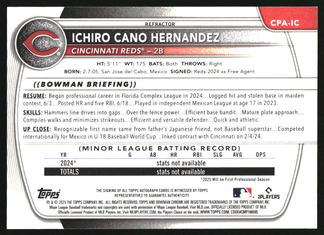 2025 Bowman Chrome Autographs Refractor Ichiro Cano Hernandez RC Auto /499
