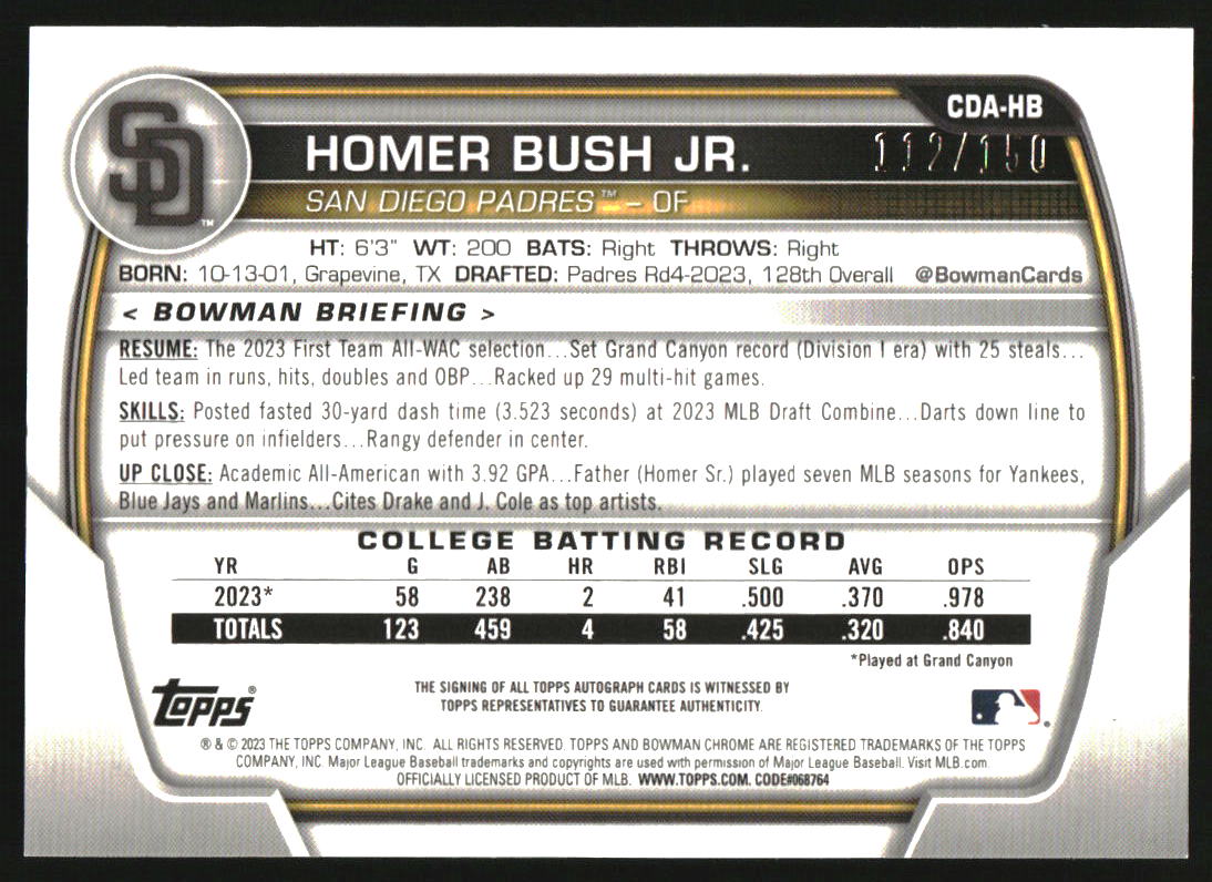 2023 Bowman Draft Chrome Autographs HTA Choice #HB Homer Bush Jr. RC Auto /150