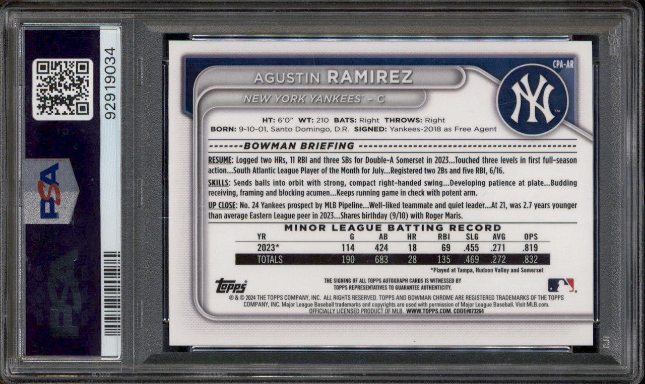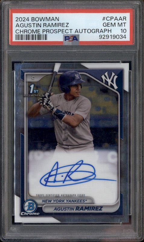 2024 Bowman Chrome Prospect Autographs #CPAAR Agustin Ramirez RC Auto PSA 10