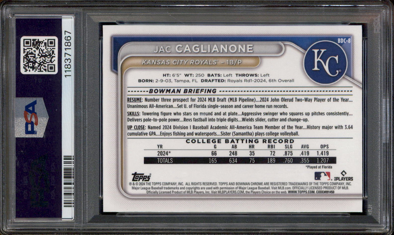 2024 Bowman Draft Chrome #BDC8 Jac Caglianone RC PSA 10