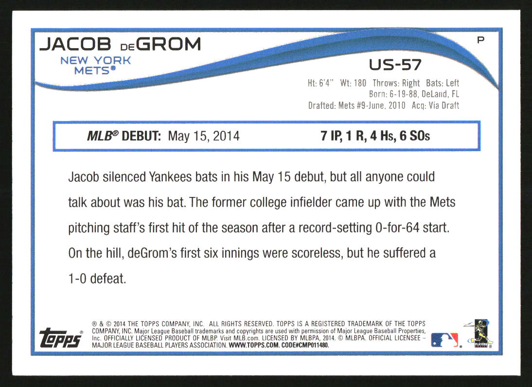 2014 Topps Update Walmart Blue Border #US-57 Jacob deGrom RC
