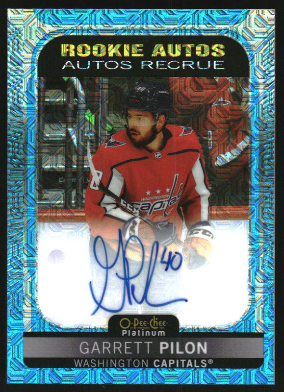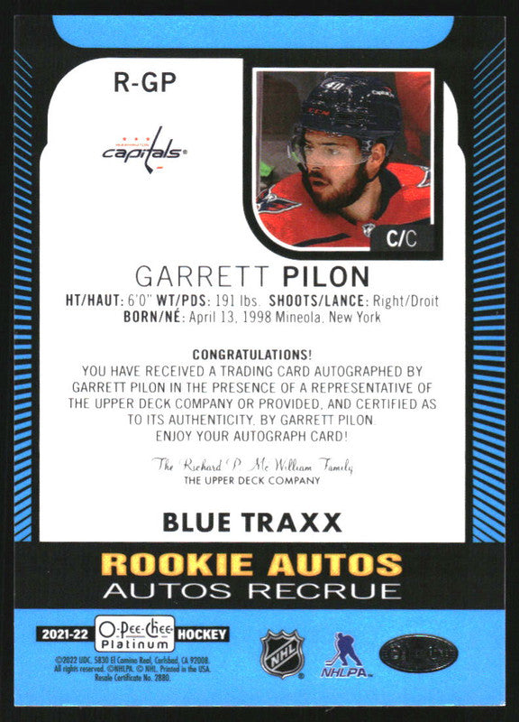 2021-22 O-Pee-Chee Platinum Rookie Autographs Blue Traxx Garrett Pilon Auto