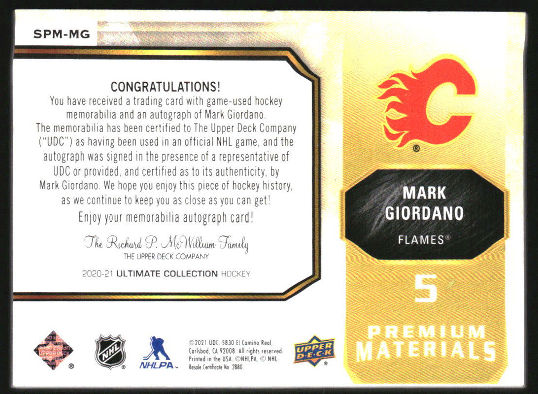 2020-21 Ultimate Collection Premium Material Signatures Mark Giordano Auto /35