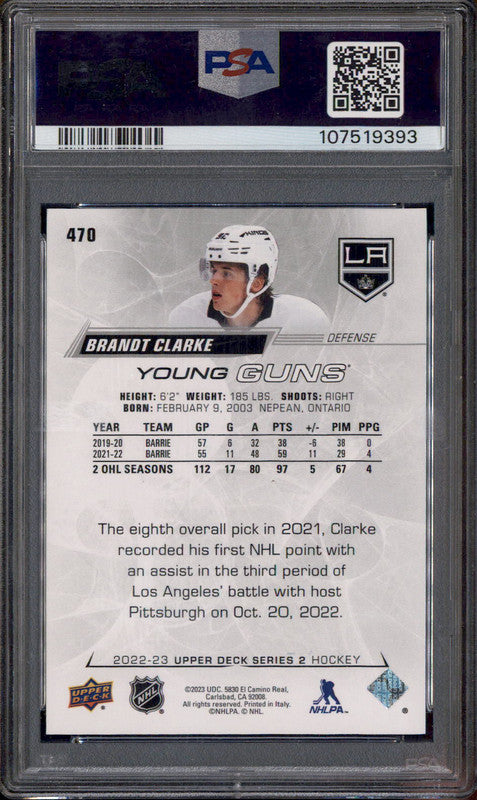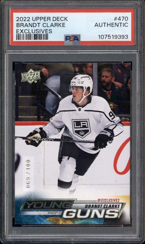 2022 Upper Deck Exclusives #470 Brandt Clarke Young Guns RC /100 PSA Authentic