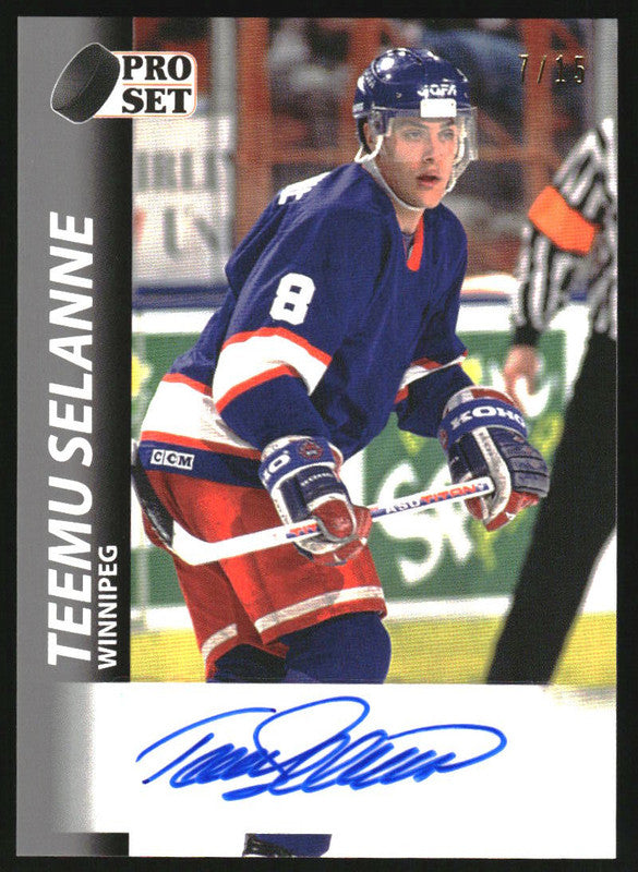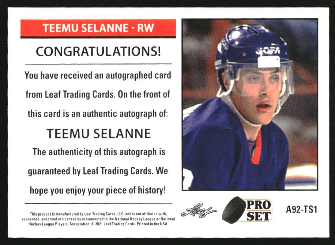 2020-21 Pro Set Memories 1992 93 Hockey Silver #A92-TS1 Teemu Selanne Auto /15