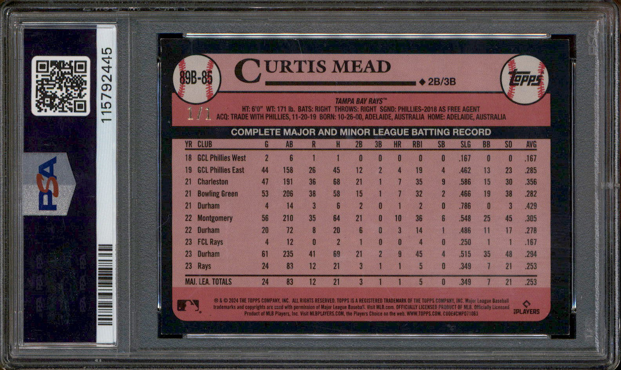 2024 Topps 1989 Topps Baseball Platinum #89B85 Curtis Mead 1/1 PSA 8