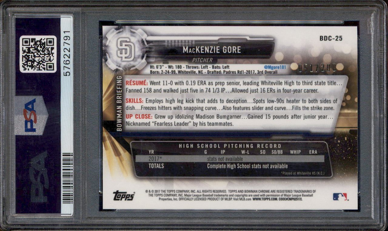 2017 Bowman Draft Chrome 70th Refractor #BDC25 Mackenzie Gore RC /200 PSA 10