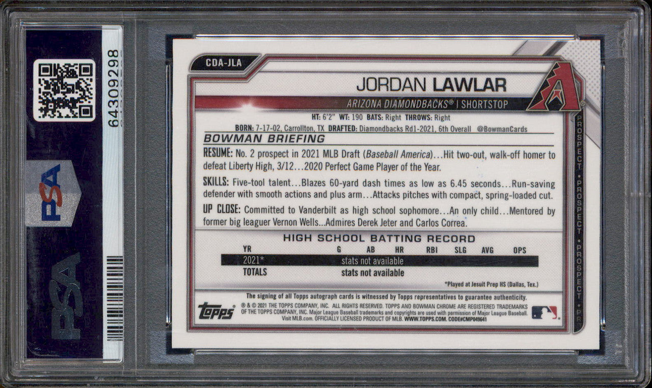 2021 Bowman Chrome Draft Rookie Auto #CDAJLA Jordan Lawlar RC PSA 10
