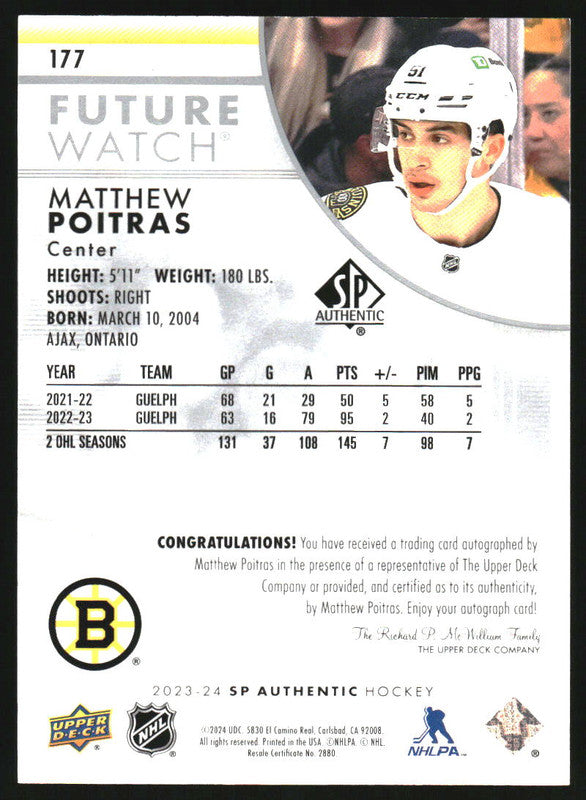 2023 SP Authentic #177 Matthew Poitras Autograph RC Future Watch Auto /999
