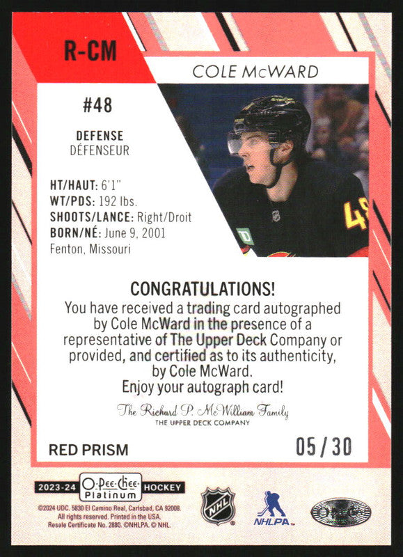 2023 O-Pee-Chee Platinum Rookie Auto Red Prism #R-CM Cole McWard RC Auto /30