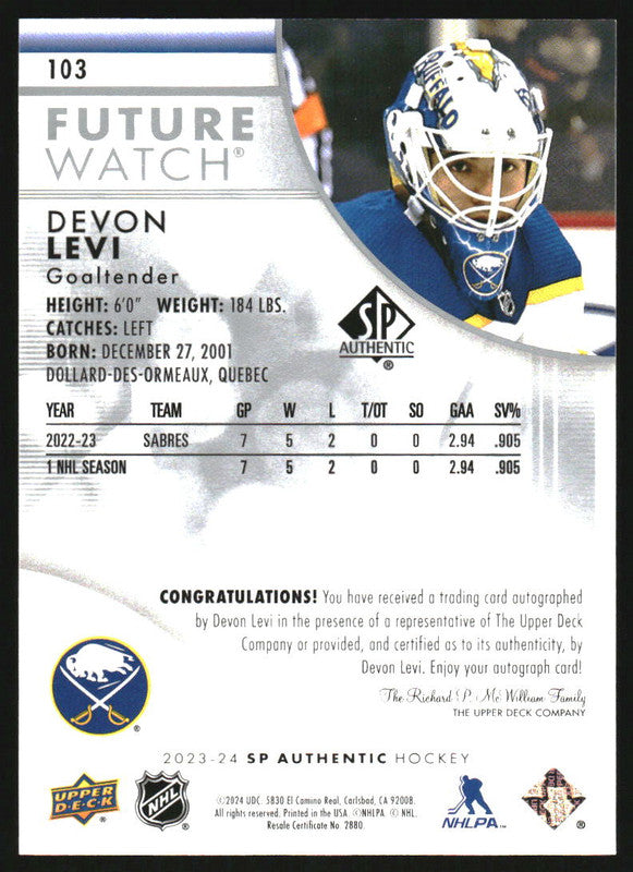 2023 SP Authentic #103 Devon Levi Autograph RC Future Watch Auto /999