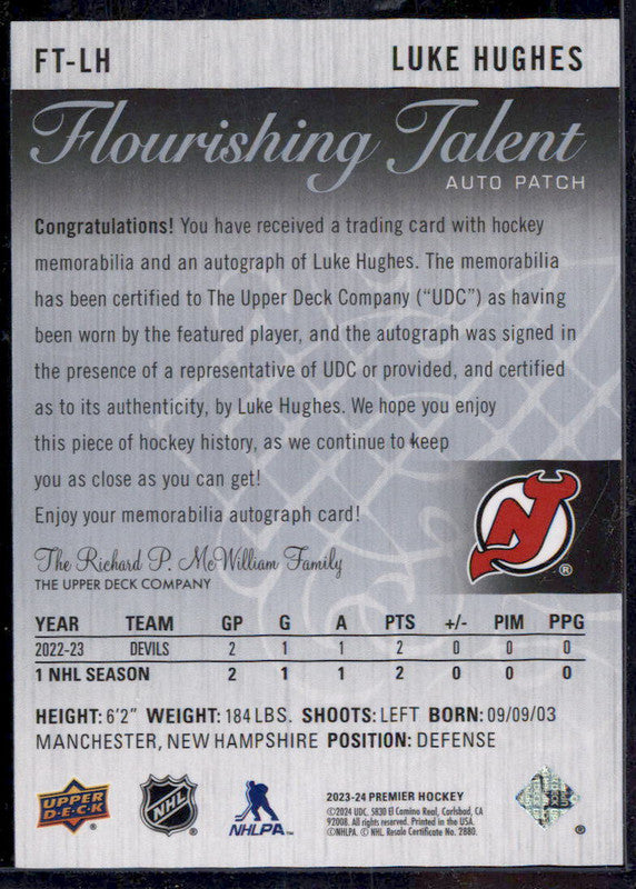 2023 UD Premier Flourishing Talent Auto Patch #FT-LH Luke Hughes RC Auto /50